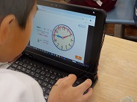時計を見て時間の学習をしていました。「ある時刻からある時刻までの時間はどれだけでしょう。」という問いに対して、タブレットで時計の針を動かしながら考えました。