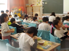 今月の給食目標「感謝して食べよう」は作ってもらった人にお礼を言うだけでなく、きれいに食べることも感謝を表すことにつながります。どのクラスもみんなで残さないようにがんばって食べている姿が見られました。