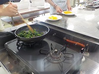 家庭科の時間、青菜とスクランブルエッグの調理実習に取り組んでいます。