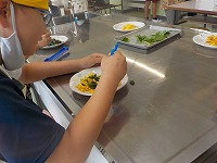 子どもたちで役割分担しながら青菜を炒めたり、盛り付けたりしていました。今日は食べるタイミングで授業を見ることができました。おいしそうに食べながらも塩コショウを振りかけて味を調整する姿も見られました。家庭での一品に加えられるように家でも実習で学んだことをやってみてください。