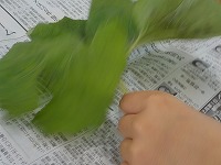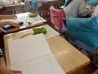 理科の時間、ハスの葉を教室に持ってきて観察していました。大きさやにおい、手触りなど触りながらわかったこともノートに書きながら観察していました。