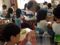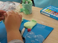 図工の時間、紙粘土を使って、ペットボトルや牛乳パックを使い様々なものに変身させながら作品を作っていました。