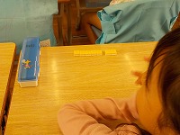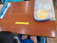 算数ブロックを使って、数のしくみを学習しています。7を2と5にわける問題では、ブロックをすぐに分けることができました。子どもたちは日々の活動を通して具体物がなくても計算がスムーズにできるようになっています。