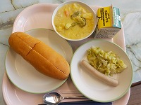 今日の給食は、米粉パン、牛乳、ソーセージ、カレーキャベツ、コーンチャウダーでした。