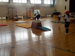 跳び箱を使ってマットに跳び下りています。ピタッと着地が止まるように気をつけていました。勢いよく跳ぶと停まれないことが多く、勢いや高さを考えながら跳んでいる姿が見られました。