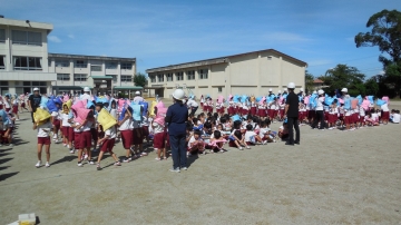 今日の5限目は今年度2回目の避難訓練でした。2限目実施予定でしたが、運動場の状態が悪く、今日の午後に延期して行いました。今回は家庭科室より出火し、延焼の危険があるため避難するという想定でした。防災頭巾をかぶり、口にはハンカチをあてて煙を吸わないようにして避難しました。暑い中での訓練でしたが、子どもたちは真剣に取り組んでいました。運動場に集合し、全員安全に避難したのを確認した後、校長先生からの講評は教室に戻ってから放送で聞きました。