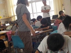 道徳の時間、車いすの人の夢や希望を叶えることについて考えました。電車に乗って旅行に行くのが楽しみにしている人が駅での事故に巻き込まれて亡くなってしまいました。子どもたちは、「万博にいきたい」という夢をかなえようとしている車いすの人にどのような声をかけるのか考えました。「いった方がよい」「いかない方がよい」をポジショニングで表し、自分の思いを発表しました。