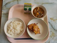 今日の給食は、米飯、牛乳、かみかみかき揚げ、豚汁でした。