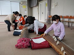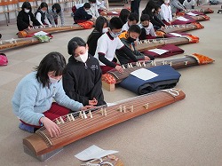 今年から音楽の教科書がかわり、4年生の「日本の楽器に楽しみましょう」という単元で、箏、三味線、三線が紹介されています。今日はお二人ゲストティーチャーの方に来ていただき、「さくら さくら」の演奏を体験させていただきました。箏の演奏の仕方を教えていただくなかで、箏の音色のよさや面白さを感じていました。