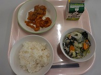 今日の給食は、米飯、牛乳、鶏肉のチリソースがらめ、ワンタンスープでした。