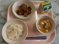 今日の給食は、米飯、牛乳、さばとごぼうのみそ煮、けんちん汁でした。