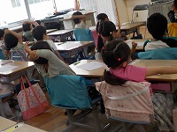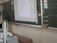 国語の時間、「め」の練習をしました。黒板に映し出された大きな「め」の字を見ながら腕全体で「め」を練習しました。メダカやメガネ、目覚まし時計など「め」のつく言葉をたくさん出しました。