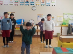 やまびこ学級の子どもたちは、2番目に「まねっこ体操」を行い、前でポーズをとったこの真似をしながら発表しました。