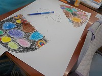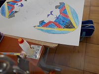 図工の時間、たまごの殻が両端にあり、その中からいろいろな楽しいものが出てきています。子どもたちは、たまごも色それぞれ、カラフルなものを描き、その中から出てくるものは、楽しいものがいっぱい出てきていました。