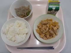 今日の給食は、米飯、牛乳、鶏肉の照り煮、ごぼうの中華きんぴらでした。