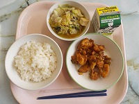 今日の給食は、米飯、牛乳、ユーリンチー、キャベツとつなのうま煮でした。