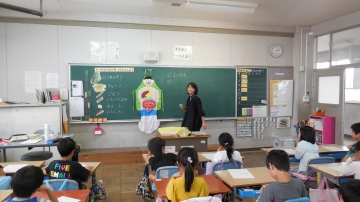 「食べ物のたびをたんけんしよう」をテーマに食べた物がどこを通り、どうなっていくのか、栄養教諭の先生から紙芝居や絵図を使って話をしていただきました。大事なことはよく噛むこと・好き嫌いなく食べることです。せっかく食べた物が十分体に吸収されるような食べ方をしていけるといいなと思います。今日は自分の食べ方を見直すいい機会となりました。
