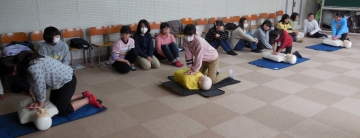 日赤救急法指導員の先生方にもご協力をいただきながら、養護教諭の先生が中心となって、高学年の子どもたちに救急法の講習会を実施しています。時間とともに救命率が下がることや、AEDの使い方、練習用の人形を使っての胸部圧迫の方法などを学びました。この講習会を通して、一人ひとりの子どもたちが自分や家族など大切な人の命を守ることについて考えるいい機会となっています。