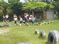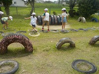 梅雨の合間の天候で20分休みは元気に運動場で遊んでいます。低学年の子どもたちは、吉田山だけでなくタイヤコーナーも人気がある遊び場となっています。