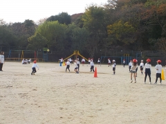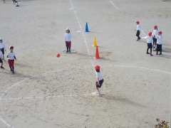 運動場でベースボール型の運動で元気な声が響いていました。子どもたちは一つのボールに集中して守り動いています。