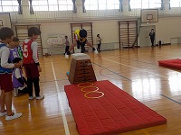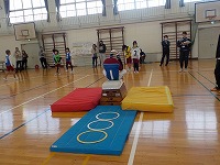 開脚跳びと台上前転に挑戦しました。子どもたちは互いに技のポイントを見合ってきれいに跳べるようにチャレンジしました。