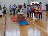 体育の時間、跳び箱運動に全校で取り組んでいます。