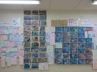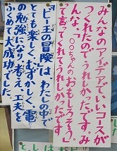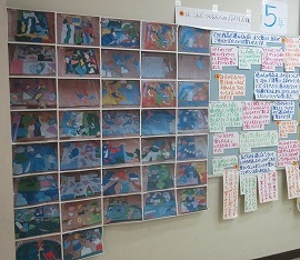 児童玄関横の壁面、新たな掲示物の題名は『ビー玉の冒険』、5年生図工科作品です。