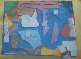 電気のこぎりで加工した板をもとに、さまざまな材料と彩色で