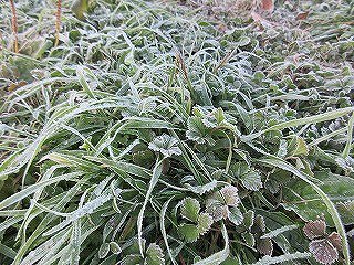 霜が降りました。雑草も白くなっています。冬の朝です。