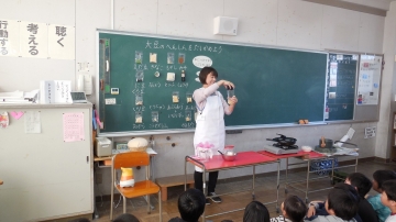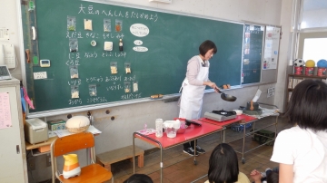 3年生の国語には「すがたをかえる大豆」という説明文教材があります。教科書には、大豆は粉になったり豆乳になったり、おから・豆腐・みそ・しょうゆなどいろいろなものに姿を変えて食べられていますと記述されています。今回は文章に書かれた内容「いる」「すりつぶす」「粉にする」といったことを目の前で栄養教諭の先生に実演してもらいました。子どもたちは大豆がいろいろな姿に変わっていくのを見て大喜び。興味津々にその様子を見ていました。この授業を通して、文章の内容をよりいっそう理解することができました。