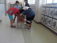 休み時間の様子です。廊下に置いているメダカの水槽をのぞき込んだり、そばに置いている卵の観察をしたりしています。