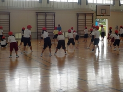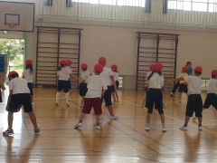 体育の時間、リズムに合わせて身体を動かしていました。子どもたちは大きく表現することを心がけながら動いています。運動会が1か月後、各学年クラスルームにダンス動画を紹介し、家でも練習していることと思います。