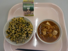 今日の給食は、鶏そぼろ丼、牛乳、味噌汁でした。