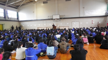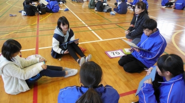常磐中学校の1年生と常磐小学校・常磐西小学校の6年生が、中学校の体育館に集まり、「常磐中校区人権フォーラム」が行われました。それぞれの学校から数名ずつ集まってグループを作り、中学1年生が司会となって話し合いをしました。「『あの子があなたの悪口をいっていたよ。』と仲良しの子に言われたら、信じてしまう。」といったことなど、「私」ならどのように考え、どう行動するのかをグループ間で意見を交流し合いました。今回の話し合いを通して気づいたこと・学んだことを日常の実生活に生かしていってほしいと思います。。最後に、常磐地区人権・同和教育推進協議会の人権標語の表彰式がありました。