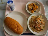 今日の給食は、小型玄米パン、発酵乳、冷やし中華、フライドポテトでした。