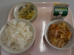 今日の給食は、米飯、牛乳、鶏すき、小松菜の和え物でした。