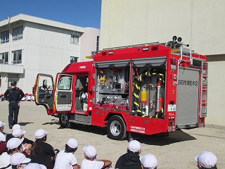 「車両見学」、実際の消防車を見せていただきました。