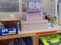 算数の時間、箱を使って楽しい形を作ったようでロッカーの上に飾ってありました。子どもたちには、箱が生き物の体になったりビルになったりするようです。子どもたちの想像力は豊かですね。子どもたちの想像力をこれからも授業を通して広げていきたいものです。