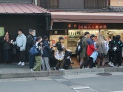 1日目のお楽しみ買い物学習で嵐山にやってきました。嵐山の紅葉がたいへんきれいで、観光客もたくさんいます。子どもたちは決められた範囲で家族や自分のお土産を買い物班で楽しみました。短い時間でしたが、みんなお目当てのものを探していましたが、たくさんの土産物で迷ってしまった班もありました。