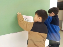 子どもたちは、包装紙や段ボールだけでなく、廊下の掲示板を使って模様をつけている子もいました。