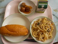 今日の給食は、小型玄米パン、牛乳、焼うどん、肉団子の甘酢煮でした。