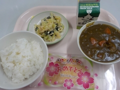 今日の給食は、米飯、牛乳、ポークカレー、チーズ入り海藻サラダ、お祝いクレープでした。