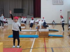 体育館で跳び箱を開脚跳びで跳び越えていました。跳び箱を跳び越した後マットにピタッと止まるように指示されていて、子どもたちはピタッと着地できるように練習していました。