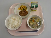 子どもたちに大人気のハンバーグが出て大喜び。学級では、半分や1/4に分けてじゃんけんをするなどみんなで楽しく最後の給食をいただきました。