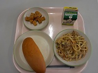 今日の給食は、小型玄米パン、牛乳、焼きうどん、高野豆腐のあげがらめでした。