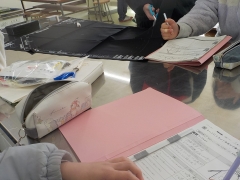 家庭科の時間、エプロンつくりに取り組んでいました。余分な布を切り、完成に近づいています。