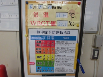 感染症予防のためマスクをしての生活で、気温が高くなるこれからは熱中症も心配です。今日からWBGT値を測定して注意していこうと思います。今日は曇り空で気温が低く安全でした。気温の高い時には換気に気を付けながら、エアコンも使用していきたいと思います。