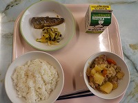 今日の給食は、米飯、牛乳、いわしのピリ辛煮、肉じゃがでした。いわしのピリ辛煮は、思い出の給食メニューの一つです。子どもたちが魚をたべるきっかけにもなるメニューです。