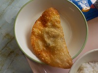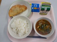 今日の給食は、米飯、魚ふりかけ、牛乳、津ぎょうざ、地物たっぷり味噌汁でした。