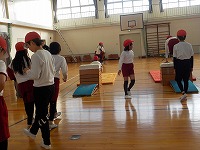 開脚跳びとは違って窮屈な跳び方になりますが、子どもたちは踏切や手のつき方などを考えて練習していました。